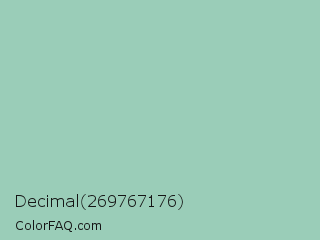 Decimal 269767176 Color is a light green color and the nearest color is Shadow Green #9ac2b8. Hex code #9acdb8 and RGB value is rgb(154,205,184). In RGB color space, this color is composed of 60% red, 80% green, 72% blue, In CMYK color space, this color is composed of 25% cyan, 0% magenta, 10% yellow , 20% black , In HSL color space, this color has a hue angle of 155° , 34% saturation and 70% lightness.