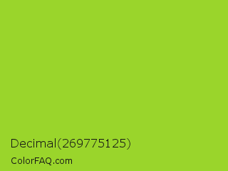 Decimal 269775125 Color is a normal green color and the nearest color is Atlantis #97cd2d. Hex code #9ad52b and RGB value is rgb(154,213,43). In RGB color space, this color is composed of 60% red, 84% green, 17% blue, In CMYK color space, this color is composed of 28% cyan, 0% magenta, 80% yellow , 16% black , In HSL color space, this color has a hue angle of 81° , 67% saturation and 50% lightness.