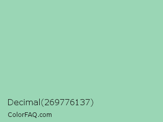 Decimal 269776137 Color is a light green color and the nearest color is Turquoise Green #a0d6b4. Hex code #9ad6b5 and RGB value is rgb(154,214,181). In RGB color space, this color is composed of 60% red, 84% green, 71% blue, In CMYK color space, this color is composed of 28% cyan, 0% magenta, 15% yellow , 16% black , In HSL color space, this color has a hue angle of 147° , 42% saturation and 72% lightness.