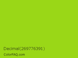 Decimal 269776391 Color is a normal lime color and the nearest color is Vivid Lime Green #a6d608. Hex code #9ad717 and RGB value is rgb(154,215,23). In RGB color space, this color is composed of 60% red, 84% green, 9% blue, In CMYK color space, this color is composed of 28% cyan, 0% magenta, 89% yellow , 16% black , In HSL color space, this color has a hue angle of 79° , 81% saturation and 47% lightness.