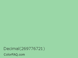 Decimal 269776721 Color is a light green color and the nearest color is Turquoise Green #a0d6b4. Hex code #9ad7a7 and RGB value is rgb(154,215,167). In RGB color space, this color is composed of 60% red, 84% green, 65% blue, In CMYK color space, this color is composed of 28% cyan, 0% magenta, 22% yellow , 16% black , In HSL color space, this color has a hue angle of 133° , 43% saturation and 72% lightness.