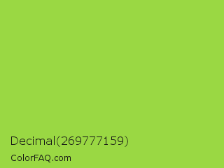Decimal 269777159 Color is a normal green color and the nearest color is Kiwi #8ee53f. Hex code #9ad843 and RGB value is rgb(154,216,67). In RGB color space, this color is composed of 60% red, 85% green, 26% blue, In CMYK color space, this color is composed of 29% cyan, 0% magenta, 69% yellow , 15% black , In HSL color space, this color has a hue angle of 85° , 66% saturation and 55% lightness.