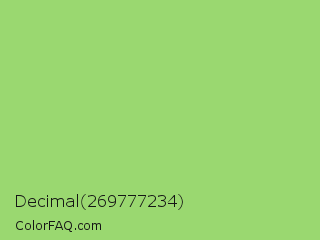Decimal 269777234 Color is a light green color and the nearest color is Pistachio #93c572. Hex code #9ad870 and RGB value is rgb(154,216,112). In RGB color space, this color is composed of 60% red, 85% green, 44% blue, In CMYK color space, this color is composed of 29% cyan, 0% magenta, 48% yellow , 15% black , In HSL color space, this color has a hue angle of 96° , 57% saturation and 64% lightness.