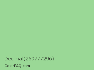 Decimal 269777296 Color is a light green color and the nearest color is Granny Smith Apple Crayola #9de093. Hex code #9ad896 and RGB value is rgb(154,216,150). In RGB color space, this color is composed of 60% red, 85% green, 59% blue, In CMYK color space, this color is composed of 29% cyan, 0% magenta, 31% yellow , 15% black , In HSL color space, this color has a hue angle of 116° , 46% saturation and 72% lightness.
