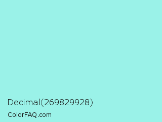Decimal 269829928 Color is a light cyan color and the nearest color is Water Leaf #a1e9de. Hex code #9af2e8 and RGB value is rgb(154,242,232). In RGB color space, this color is composed of 60% red, 95% green, 91% blue, In CMYK color space, this color is composed of 36% cyan, 0% magenta, 4% yellow , 5% black , In HSL color space, this color has a hue angle of 173° , 77% saturation and 78% lightness.