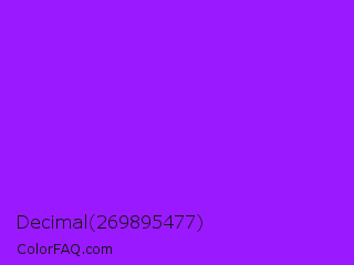 Decimal 269895477 Color is a normal purple color and the nearest color is Veronica #a020f0. Hex code #9b19ff and RGB value is rgb(155,25,255). In RGB color space, this color is composed of 61% red, 10% green, 100% blue, In CMYK color space, this color is composed of 39% cyan, 90% magenta, 0% yellow , 0% black , In HSL color space, this color has a hue angle of 274° , 100% saturation and 55% lightness.