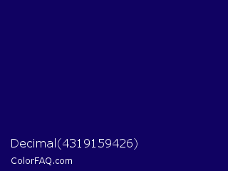 Decimal 4319159426 Color is a very dark indigo color and the nearest color is Arapawa #110c6c. Hex code #100262 and RGB value is rgb(16,2,98). In RGB color space, this color is composed of 6% red, 1% green, 38% blue, In CMYK color space, this color is composed of 84% cyan, 98% magenta, 0% yellow , 62% black , In HSL color space, this color has a hue angle of 249° , 96% saturation and 20% lightness.