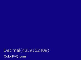Decimal 4319162409 Color is a dark indigo color and the nearest color is Ultramarine #120a8f. Hex code #100485 and RGB value is rgb(16,4,133). In RGB color space, this color is composed of 6% red, 2% green, 52% blue, In CMYK color space, this color is composed of 88% cyan, 97% magenta, 0% yellow , 48% black , In HSL color space, this color has a hue angle of 246° , 94% saturation and 27% lightness.