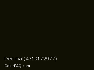 Decimal 4319172977 Color is a almost black yellow color and the nearest color is Green Waterloo #101405. Hex code #101003 and RGB value is rgb(16,16,3). In RGB color space, this color is composed of 6% red, 6% green, 1% blue, In CMYK color space, this color is composed of 0% cyan, 0% magenta, 81% yellow , 94% black , In HSL color space, this color has a hue angle of 60° , 68% saturation and 4% lightness.