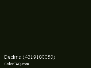 Decimal 4319180050 Color is a almost black green color and the nearest color is Green Waterloo #101405. Hex code #101608 and RGB value is rgb(16,22,8). In RGB color space, this color is composed of 6% red, 9% green, 3% blue, In CMYK color space, this color is composed of 27% cyan, 0% magenta, 64% yellow , 91% black , In HSL color space, this color has a hue angle of 86° , 47% saturation and 6% lightness.