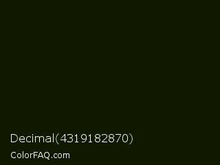 Decimal 4319182870 Color is a almost black green color and the nearest color is Green Waterloo #101405. Hex code #101800 and RGB value is rgb(16,24,0). In RGB color space, this color is composed of 6% red, 9% green, 0% blue, In CMYK color space, this color is composed of 33% cyan, 0% magenta, 100% yellow , 91% black , In HSL color space, this color has a hue angle of 80° , 100% saturation and 5% lightness.