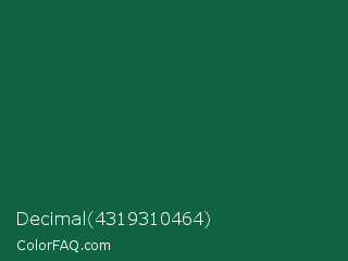 Decimal 4319310464 Color is a dark green color and the nearest color is Jewel #126b40. Hex code #106340 and RGB value is rgb(16,99,64). In RGB color space, this color is composed of 6% red, 39% green, 25% blue, In CMYK color space, this color is composed of 84% cyan, 0% magenta, 35% yellow , 61% black , In HSL color space, this color has a hue angle of 155° , 72% saturation and 23% lightness.