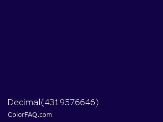 Decimal 4319576646 Color is a very dark indigo color and the nearest color is Tolopea #1b0245. Hex code #110346 and RGB value is rgb(17,3,70). In RGB color space, this color is composed of 7% red, 1% green, 27% blue, In CMYK color space, this color is composed of 76% cyan, 96% magenta, 0% yellow , 73% black , In HSL color space, this color has a hue angle of 253° , 92% saturation and 14% lightness.