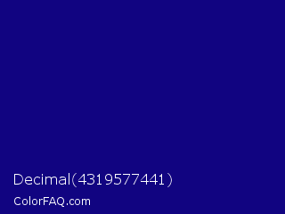Decimal 4319577441 Color is a dark indigo color and the nearest color is Ultramarine #120a8f. Hex code #110481 and RGB value is rgb(17,4,129). In RGB color space, this color is composed of 7% red, 2% green, 51% blue, In CMYK color space, this color is composed of 87% cyan, 97% magenta, 0% yellow , 49% black , In HSL color space, this color has a hue angle of 246° , 94% saturation and 26% lightness.