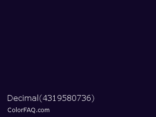 Decimal 4319580736 Color is a almost black indigo color and the nearest color is Black Rock #0d0332. Hex code #110728 and RGB value is rgb(17,7,40). In RGB color space, this color is composed of 7% red, 3% green, 16% blue, In CMYK color space, this color is composed of 58% cyan, 83% magenta, 0% yellow , 84% black , In HSL color space, this color has a hue angle of 258° , 70% saturation and 9% lightness.