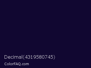 Decimal 4319580745 Color is a very dark indigo color and the nearest color is Black Rock #0d0332. Hex code #110731 and RGB value is rgb(17,7,49). In RGB color space, this color is composed of 7% red, 3% green, 19% blue, In CMYK color space, this color is composed of 65% cyan, 86% magenta, 0% yellow , 81% black , In HSL color space, this color has a hue angle of 254° , 75% saturation and 11% lightness.