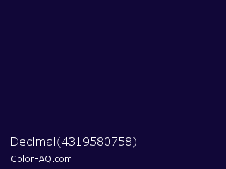 Decimal 4319580758 Color is a very dark indigo color and the nearest color is Black Rock #0d0332. Hex code #110738 and RGB value is rgb(17,7,56). In RGB color space, this color is composed of 7% red, 3% green, 22% blue, In CMYK color space, this color is composed of 70% cyan, 88% magenta, 0% yellow , 78% black , In HSL color space, this color has a hue angle of 252° , 78% saturation and 12% lightness.