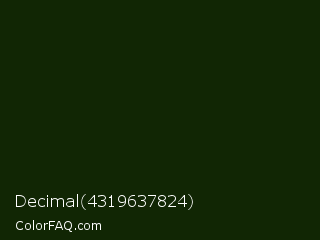 Decimal 4319637824 Color is a almost black green color and the nearest color is Pine Tree #171f04. Hex code #112604 and RGB value is rgb(17,38,4). In RGB color space, this color is composed of 7% red, 15% green, 2% blue, In CMYK color space, this color is composed of 55% cyan, 0% magenta, 89% yellow , 85% black , In HSL color space, this color has a hue angle of 97° , 81% saturation and 8% lightness.