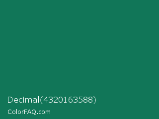 Decimal 4320163588 Color is a dark green color and the nearest color is Deep Green Cyan Turquoise #0e7c61. Hex code #117658 and RGB value is rgb(17,118,88). In RGB color space, this color is composed of 7% red, 46% green, 35% blue, In CMYK color space, this color is composed of 86% cyan, 0% magenta, 25% yellow , 54% black , In HSL color space, this color has a hue angle of 162° , 75% saturation and 26% lightness.