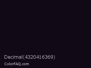 Decimal 4320416369 Color is a almost black purple color and the nearest color is Cinder #0e0e18. Hex code #120917 and RGB value is rgb(18,9,23). In RGB color space, this color is composed of 7% red, 4% green, 9% blue, In CMYK color space, this color is composed of 22% cyan, 61% magenta, 0% yellow , 91% black , In HSL color space, this color has a hue angle of 279° , 44% saturation and 6% lightness.