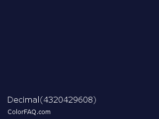 Decimal 4320429608 Color is a very dark blue color and the nearest color is Haiti #1b1035. Hex code #121634 and RGB value is rgb(18,22,52). In RGB color space, this color is composed of 7% red, 9% green, 20% blue, In CMYK color space, this color is composed of 65% cyan, 58% magenta, 0% yellow , 80% black , In HSL color space, this color has a hue angle of 233° , 49% saturation and 14% lightness.