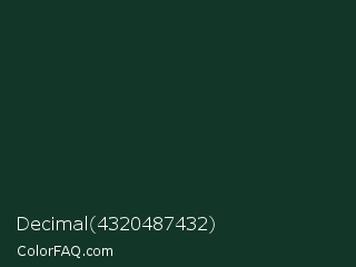 Decimal 4320487432 Color is a very dark green color and the nearest color is Phthalo Green #123524. Hex code #123628 and RGB value is rgb(18,54,40). In RGB color space, this color is composed of 7% red, 21% green, 16% blue, In CMYK color space, this color is composed of 67% cyan, 0% magenta, 26% yellow , 79% black , In HSL color space, this color has a hue angle of 157° , 50% saturation and 14% lightness.