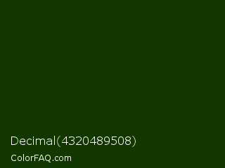 Decimal 4320489508 Color is a very dark green color and the nearest color is Deep Forest Green #182d09. Hex code #123700 and RGB value is rgb(18,55,0). In RGB color space, this color is composed of 7% red, 22% green, 0% blue, In CMYK color space, this color is composed of 67% cyan, 0% magenta, 100% yellow , 78% black , In HSL color space, this color has a hue angle of 100° , 100% saturation and 11% lightness.