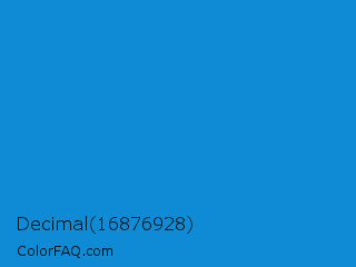 Decimal 16876928 Color is a normal blue color and the nearest color is Rich Electric Blue #0892d0. Hex code #0f8ad4 and RGB value is rgb(15,138,212). In RGB color space, this color is composed of 6% red, 54% green, 83% blue, In CMYK color space, this color is composed of 93% cyan, 35% magenta, 0% yellow , 17% black , In HSL color space, this color has a hue angle of 203° , 87% saturation and 45% lightness.