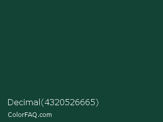 Decimal 4320526665 Color is a very dark green color and the nearest color is MSU Green #18453b. Hex code #124335 and RGB value is rgb(18,67,53). In RGB color space, this color is composed of 7% red, 26% green, 21% blue, In CMYK color space, this color is composed of 73% cyan, 0% magenta, 21% yellow , 74% black , In HSL color space, this color has a hue angle of 163° , 58% saturation and 17% lightness.