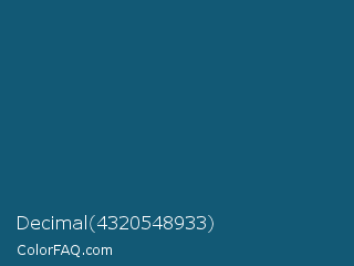 Decimal 4320548933 Color is a dark blue color and the nearest color is Chathams Blue #175579. Hex code #125975 and RGB value is rgb(18,89,117). In RGB color space, this color is composed of 7% red, 35% green, 46% blue, In CMYK color space, this color is composed of 85% cyan, 24% magenta, 0% yellow , 54% black , In HSL color space, this color has a hue angle of 197° , 73% saturation and 26% lightness.