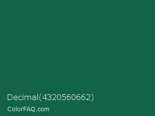 Decimal 4320560662 Color is a dark green color and the nearest color is Jewel #126b40. Hex code #126448 and RGB value is rgb(18,100,72). In RGB color space, this color is composed of 7% red, 39% green, 28% blue, In CMYK color space, this color is composed of 82% cyan, 0% magenta, 28% yellow , 61% black , In HSL color space, this color has a hue angle of 160° , 69% saturation and 23% lightness.