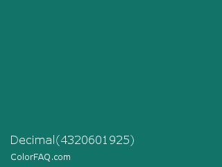 Decimal 4320601925 Color is a dark cyan color and the nearest color is Genoa #15736b. Hex code #127469 and RGB value is rgb(18,116,105). In RGB color space, this color is composed of 7% red, 45% green, 41% blue, In CMYK color space, this color is composed of 84% cyan, 0% magenta, 9% yellow , 55% black , In HSL color space, this color has a hue angle of 173° , 73% saturation and 26% lightness.
