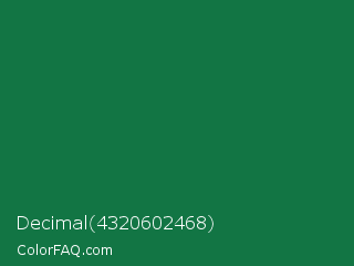 Decimal 4320602468 Color is a dark green color and the nearest color is Dark Spring Green #177245. Hex code #127544 and RGB value is rgb(18,117,68). In RGB color space, this color is composed of 7% red, 46% green, 27% blue, In CMYK color space, this color is composed of 85% cyan, 0% magenta, 42% yellow , 54% black , In HSL color space, this color has a hue angle of 150° , 73% saturation and 26% lightness.