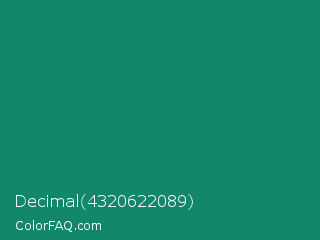 Decimal 4320622089 Color is a dark cyan color and the nearest color is Elf Green #088370. Hex code #128769 and RGB value is rgb(18,135,105). In RGB color space, this color is composed of 7% red, 53% green, 41% blue, In CMYK color space, this color is composed of 87% cyan, 0% magenta, 22% yellow , 47% black , In HSL color space, this color has a hue angle of 165° , 76% saturation and 30% lightness.