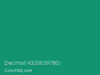 Decimal 4320659780 Color is a normal green color and the nearest color is Elf Green #088370. Hex code #129470 and RGB value is rgb(18,148,112). In RGB color space, this color is composed of 7% red, 58% green, 44% blue, In CMYK color space, this color is composed of 88% cyan, 0% magenta, 24% yellow , 42% black , In HSL color space, this color has a hue angle of 163° , 78% saturation and 33% lightness.
