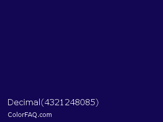 Decimal 4321248085 Color is a very dark indigo color and the nearest color is Tolopea #1b0245. Hex code #130753 and RGB value is rgb(19,7,83). In RGB color space, this color is composed of 7% red, 3% green, 33% blue, In CMYK color space, this color is composed of 77% cyan, 92% magenta, 0% yellow , 67% black , In HSL color space, this color has a hue angle of 249° , 84% saturation and 18% lightness.