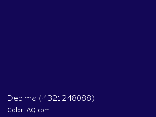 Decimal 4321248088 Color is a very dark indigo color and the nearest color is Tolopea #1b0245. Hex code #130756 and RGB value is rgb(19,7,86). In RGB color space, this color is composed of 7% red, 3% green, 34% blue, In CMYK color space, this color is composed of 78% cyan, 92% magenta, 0% yellow , 66% black , In HSL color space, this color has a hue angle of 249° , 85% saturation and 18% lightness.