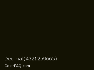 Decimal 4321259665 Color is a almost black yellow color and the nearest color is Green Waterloo #101405. Hex code #131203 and RGB value is rgb(19,18,3). In RGB color space, this color is composed of 7% red, 7% green, 1% blue, In CMYK color space, this color is composed of 0% cyan, 5% magenta, 84% yellow , 93% black , In HSL color space, this color has a hue angle of 56° , 73% saturation and 4% lightness.