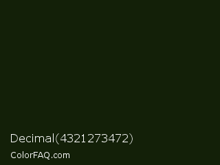 Decimal 4321273472 Color is a almost black green color and the nearest color is Pine Tree #171f04. Hex code #132008 and RGB value is rgb(19,32,8). In RGB color space, this color is composed of 7% red, 13% green, 3% blue, In CMYK color space, this color is composed of 41% cyan, 0% magenta, 75% yellow , 87% black , In HSL color space, this color has a hue angle of 93° , 60% saturation and 8% lightness.