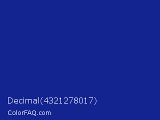Decimal 4321278017 Color is a normal blue color and the nearest color is Indigo Dye #091f92. Hex code #132491 and RGB value is rgb(19,36,145). In RGB color space, this color is composed of 7% red, 14% green, 57% blue, In CMYK color space, this color is composed of 87% cyan, 75% magenta, 0% yellow , 43% black , In HSL color space, this color has a hue angle of 232° , 77% saturation and 32% lightness.
