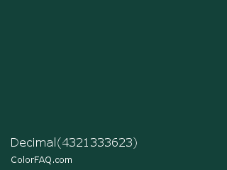 Decimal 4321333623 Color is a very dark cyan color and the nearest color is MSU Green #18453b. Hex code #134139 and RGB value is rgb(19,65,57). In RGB color space, this color is composed of 7% red, 25% green, 22% blue, In CMYK color space, this color is composed of 71% cyan, 0% magenta, 12% yellow , 75% black , In HSL color space, this color has a hue angle of 170° , 55% saturation and 16% lightness.