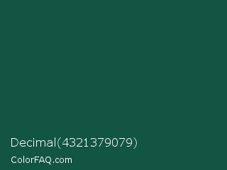 Decimal 4321379079 Color is a very dark cyan color and the nearest color is Brunswick Green #1b4d3e. Hex code #135543 and RGB value is rgb(19,85,67). In RGB color space, this color is composed of 7% red, 33% green, 26% blue, In CMYK color space, this color is composed of 78% cyan, 0% magenta, 21% yellow , 67% black , In HSL color space, this color has a hue angle of 164° , 63% saturation and 20% lightness.