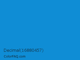 Decimal 16880457 Color is a normal blue color and the nearest color is Rich Electric Blue #0892d0. Hex code #0f8dd5 and RGB value is rgb(15,141,213). In RGB color space, this color is composed of 6% red, 55% green, 84% blue, In CMYK color space, this color is composed of 93% cyan, 34% magenta, 0% yellow , 16% black , In HSL color space, this color has a hue angle of 202° , 87% saturation and 45% lightness.