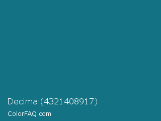 Decimal 4321408917 Color is a dark cyan color and the nearest color is Surfie Green #0c7a79. Hex code #137283 and RGB value is rgb(19,114,131). In RGB color space, this color is composed of 7% red, 45% green, 51% blue, In CMYK color space, this color is composed of 85% cyan, 13% magenta, 0% yellow , 49% black , In HSL color space, this color has a hue angle of 189° , 75% saturation and 29% lightness.