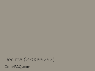 Decimal 270099297 Color is a normal orange color and the nearest color is Lemon Grass #9b9e8f. Hex code #9b9589 and RGB value is rgb(155,149,137). In RGB color space, this color is composed of 61% red, 58% green, 54% blue, In CMYK color space, this color is composed of 0% cyan, 4% magenta, 12% yellow , 39% black , In HSL color space, this color has a hue angle of 40° , 8% saturation and 57% lightness.