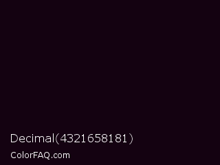 Decimal 4321658181 Color is a almost black magenta color and the nearest color is Jaguar #080110. Hex code #140211 and RGB value is rgb(20,2,17). In RGB color space, this color is composed of 8% red, 1% green, 7% blue, In CMYK color space, this color is composed of 0% cyan, 90% magenta, 15% yellow , 92% black , In HSL color space, this color has a hue angle of 310° , 82% saturation and 4% lightness.