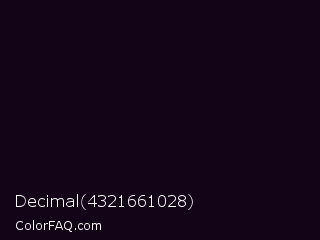 Decimal 4321661028 Color is a almost black purple color and the nearest color is Black Russian #0a001c. Hex code #140418 and RGB value is rgb(20,4,24). In RGB color space, this color is composed of 8% red, 2% green, 9% blue, In CMYK color space, this color is composed of 17% cyan, 83% magenta, 0% yellow , 91% black , In HSL color space, this color has a hue angle of 288° , 71% saturation and 5% lightness.
