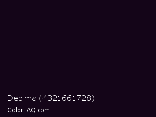 Decimal 4321661728 Color is a almost black purple color and the nearest color is Cinder #0e0e18. Hex code #140518 and RGB value is rgb(20,5,24). In RGB color space, this color is composed of 8% red, 2% green, 9% blue, In CMYK color space, this color is composed of 17% cyan, 79% magenta, 0% yellow , 91% black , In HSL color space, this color has a hue angle of 287° , 66% saturation and 6% lightness.