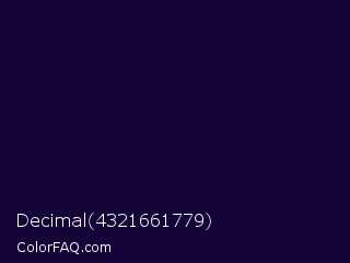 Decimal 4321661779 Color is a very dark indigo color and the nearest color is Black Rock #0d0332. Hex code #140539 and RGB value is rgb(20,5,57). In RGB color space, this color is composed of 8% red, 2% green, 22% blue, In CMYK color space, this color is composed of 65% cyan, 91% magenta, 0% yellow , 78% black , In HSL color space, this color has a hue angle of 257° , 84% saturation and 12% lightness.