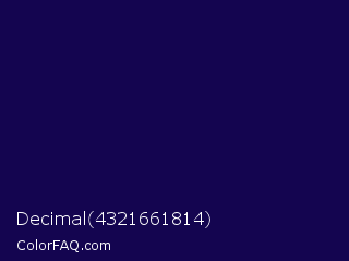 Decimal 4321661814 Color is a very dark indigo color and the nearest color is Tolopea #1b0245. Hex code #140550 and RGB value is rgb(20,5,80). In RGB color space, this color is composed of 8% red, 2% green, 31% blue, In CMYK color space, this color is composed of 75% cyan, 94% magenta, 0% yellow , 69% black , In HSL color space, this color has a hue angle of 252° , 88% saturation and 17% lightness.